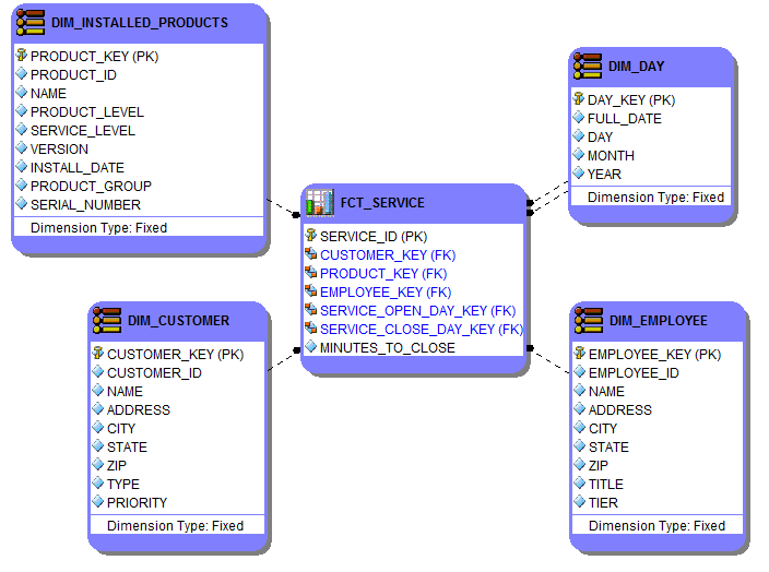 This represents a service transaction on a product, for example's sake it doesn't matter what kind of service, just that a transaction at a point in time involved a customer's product. We have the product being serviced, the customer who owns the product, the employee who serviced the product and when the service took place. Now, deriving a dimensional schema from this appears rather simple, and would probably look something like this: